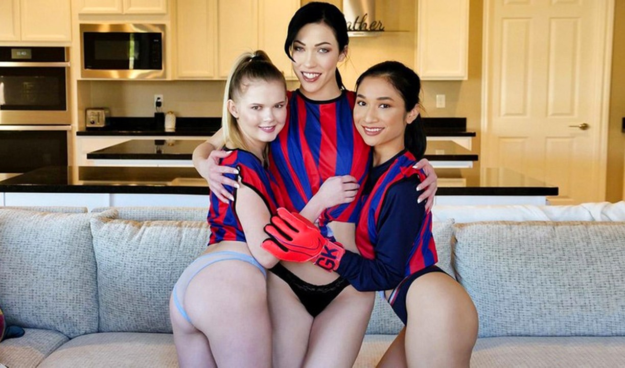 三个足球女孩在健身房与她们最喜欢的教练进行口交和群交